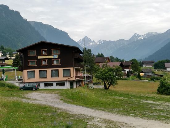 Blick vom Speiserestaurant in Richtung St. Gallenkirch. Das dunkle Gebäude links gegenüber der Tankstelle ist meine Unterkunft.