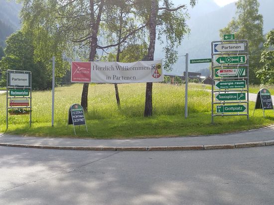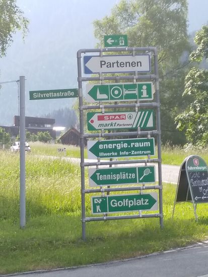 Am Ortsende von Wirl endet auch die Silvretta-Hochalpenstraße (grüne Tafel rechts und nächstes Bild).