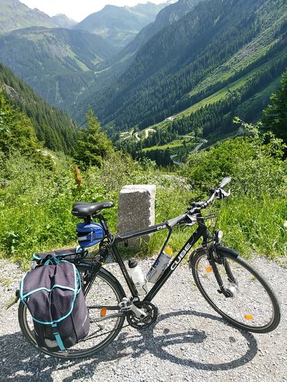 Er radelte gestern bis Partenen, bekam keine Unterkunft, radelte nach Gaschurn zurück, wo er fündig wurde und startete von dort aus kurz nachdem ich Gaschurn hinter mich gelassen hatte.