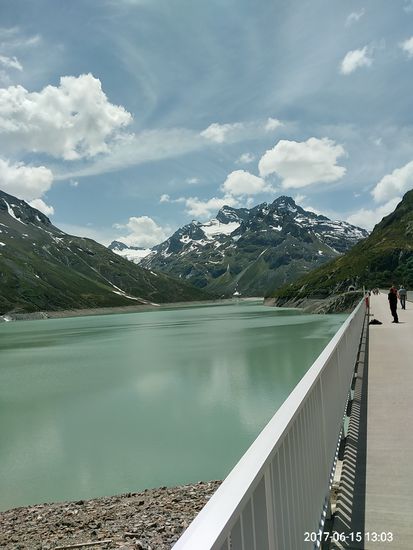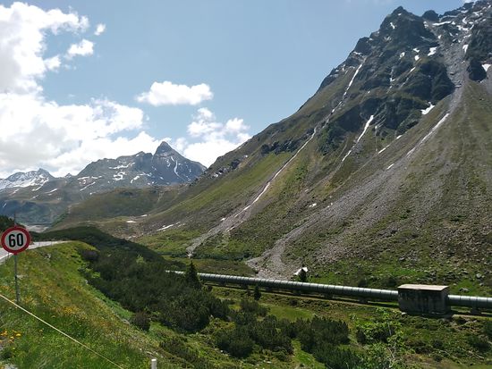 Ein relativ kurzes Stück, leider weiß ich die Kehrennummer nicht mehr, bis kurz vor dem Vermunt-Stausee, dessen Staumauer in Bildmitte sichtbar ist, habe ich eine Schiebeeinlage geleistet, weil ich einen kurzen "Motivations-Absacker" erlitt. Aber nachdem die Schieberei auch gut anstrengend war und mir dies alsbald mehr auf den Geist ging als das Getrete, war ich schnell wieder im Sattel.
