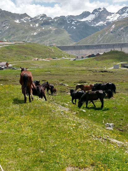 Eine Pferdekoppel, linkerhand eine nachher beschriebene Alpe, in Verlängerung der Koppel der erste Blick auf die Staumauer des Silvretta-Stausees und nach dem letzten Anstieg nach der Alpe die Bielerhöhe.