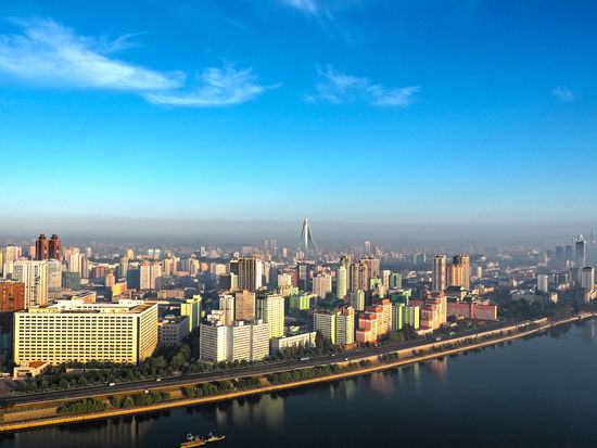 Panorama von Pjöngjang - von links nach rechts: Fabrikschlote, Koryo-Hotel (rotes Doppelgebäude), Ryugyŏng Hotel (große Pyramide), Juche-Turm (rechts vom Fluss)