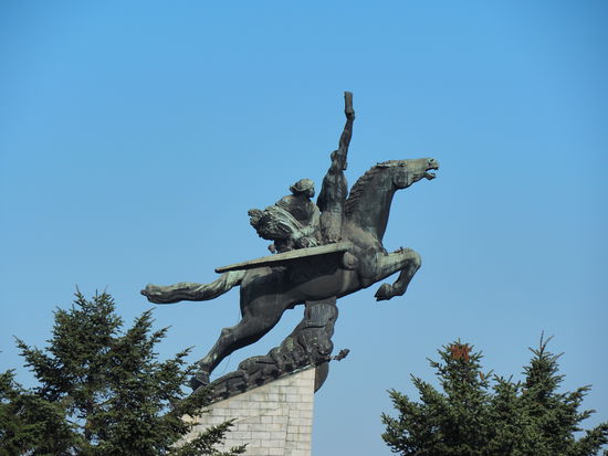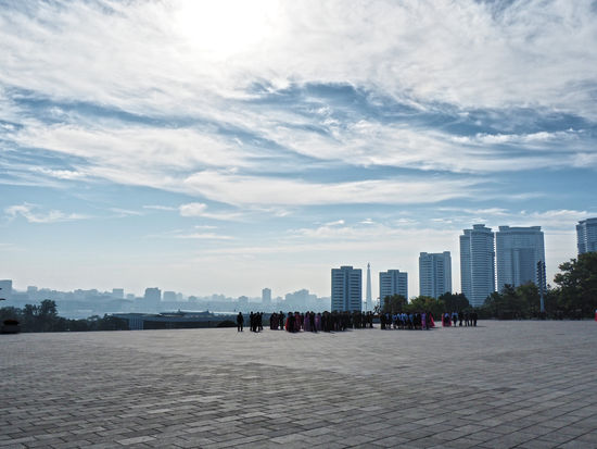 Bevor es in den Großen Studienpalast des Volkes geht, werfen wir noch einen Blick auf die Ch’ŏllima-Statue (Geflügelte Pferd als Symbol des Wiederaufbaus und der Industrialisierung) zu unserer Rechten sowie über die Stadt auf das "Monument zur Gründung der Partei der Arbeit Koreas".