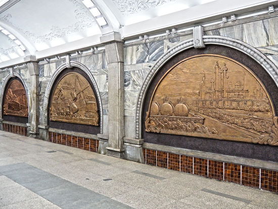 Beides ist nicht der Fall. Schon auf dem Weg "nach unten" strömen uns jede Menge Personen entgegen. Falls das Statisten für unsere persönliche Truman-Show sind, ziehe ich meinen Hut vor dem Organisationsgeschick und Schauspieltalent unserer Gastgeber! Unten angekommen bietet sich uns eine spektakuläre Szenerie! Untermalt von lauter "sozialistischer Arbeitermusik" aus diversen Lautsprechern schweift mein Blick über eine pompöse Haltestelle, die sich vor der Moskauer Metro nicht zu verstecken braucht. Die Reliefs und Mosaike dieser Haltestelle stehen unter dem Motto "Arbeit" und zeigen eine florierende Industrie + Landwirtschaft. Das zentrale Wandbild „Der Große Führer Kim Il-sung unter Arbeitern“ misst 15,8 Meter x 9,25 Meter.