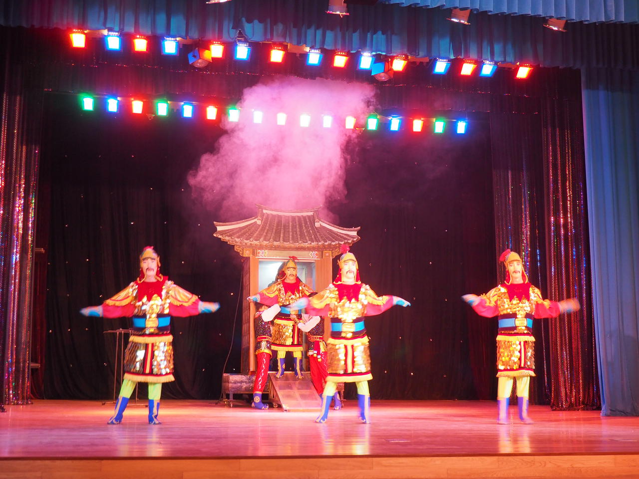Spannend ist hier eher wieder das Drumherum. Wir sind spät dran, die Reiseleiter daher etwas nervös. Als wir endlich mit dem Bus ankommen, betreten wir eine bereits annähernd komplett gefüllte Halle (vielleicht 200-300 Personen). Alle Augen sind auf uns gerichtet. Plötzlich steht in Reihe 2 ein Herr auf, der uns offenbar vier der besten Plätze reserviert hat. Wir sitzen noch nicht ganz, da startet auch schon die Show. Haben hier gerade wirklich 300 Koreaner auf vier Westler gewartet? In diesem Fall glaube ich tatsächlich fast...ja! Mann, kein Wunder, dass einige Nordkoreaner nicht so gut auf das Ausland zu sprechen sind! Während der Show werden wir immer wieder von anderen Zuschauern beobachtet. Ich glaube, es ist nicht alltäglich, dass Westler einer solchen Show beiwohnen. Wir sind ja auch nur hier, weil der Staatszirkus angeblich renoviert wird. Es erschien uns die spannendere Wahl zu sein im Vergleich zum anderen Alternativprogramm, einer koreanischen Staatsoper. Das wäre sicher schwere Kost geworden (und natürlich perfekt), aber ist Geschmackssache. Allein die Tatsache, dass wir zwei Alternativen zum ursprünglichen Programm bekommen haben, ist ja positiv hervorzuheben.