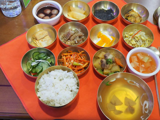 Heute gibt es ein spannendes, traditionelles Mittagessen. Früher war es in Korea wohl so, dass man je nach gesellschaftlichem Rang entweder mehr oder weniger Schüsseln beim Essen vor sich stehen haben durfte.