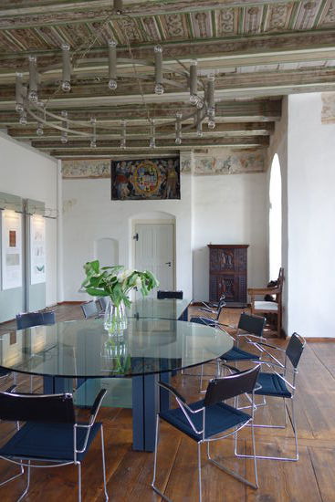 Das Kaminzimmer dient als Saal für Veranstaltungen und Trauungen, zeigt jedoch auch die Geschichte als kurfürstliches Jagdschloss.
