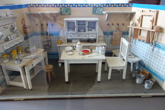Zauberhafte Exponate wie Puppenmöbel, täglicher Hausrat, Nähmaschine, Kochherd oder Waschtisch u.v.a. unzählige kleine Kostbarkeiten lassen Kinderträume erwachen. Und auch Kaufmannsläden, Puppenstuben, komplett und detailgetreu liebevoll eingerichtete Küchen.
