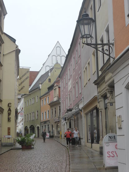 Jetzt bleiben uns noch zwei Tage, ist die Frage zu klären: Großstadt oder weitere Schlösser. Das Wetter entscheidet sich für Schlösser, denn die Wahrscheinlichkeit von heftigem Regen ist in Dresden größer als in Meißen oder Moritzburg. Als wir losfahren, regnet es und der Himmel ist vergangen. In Meißen nach einer guten Stunde angekommen, suchen wir etwas länger nach dem Parkplatz, den wir dann in hochwassergefährdeten Bereich auf der anderen Elbeseite finden. Es sind ganze 800 m Fußweg über die Brücke zur Innenstadt, und da es aufgehört hat zu regnen, mit Regenschirm bewaffnet schnell erledigt.
