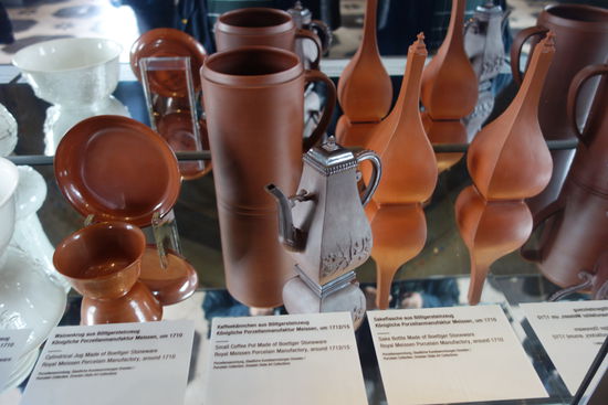 Die ersten Jahre der Manufaktur stehen ganz im Zeichen der Produktion des „Jaspisporzellans", heute Böttgersteinzeug genannt. Die Eigenschaften dieses Materials erlauben Bearbeitungstechniken, die für andere keramische Produkte nicht denkbar waren. Es entstehen dünnwandige Gefäße mit scharfgeschnittenen, feinen Dekoren, die zudem geschliffen, graviert und poliert werden können. Die Techniken sind in Sachsen und Böhmen aus der Glasindustrie bekannt, spezialisiertes Personal ist bereits vorhanden.