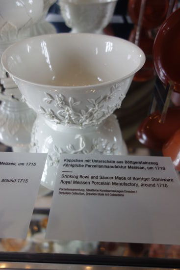 Weißes Porzellan erreicht erst um 1713 eine marktfähige Qualität. Dieses frohe Porzellan, das Böttgerporzellan, hat noch einen leicht gelblichen Farbton, hervorgerufen vom anfangs als Flussmittel verwendeten Kalk. Erst als man Kalk durch Feldspat ersetzt, gelingt in den frühen 1720er Jahren - nach Böttgers Tod - die Herstellung eines reinweißen Scherbens.