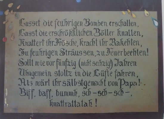 Der Weg durch den Park ist mit Tafeln ausgestattet, die in Texten seinen Lebensweg schildern und tolle Sprüchen zu Themen wie Chemie, Liebe, Philosophie …zeigen. Stellvertretend sei die Tafel für 'Feuerwerkerei' gezeigt: