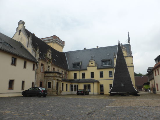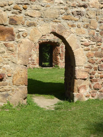 Nun wollen wir aber endlich nach Grimma, doch auf dem Weg dorthin fällt uns noch auf, dass das Kloster Nimbschen auf unserer Liste stehend am Wegesrand liegt. Als wir geparkt haben, vermisst meine Frau Ulrike ihre Brille. Sie kann nur noch bei Herrn Ostwald liegen. Gottseidank ist es nicht weit und danach haben wir auch geklärt, dass man hier mit derSchlösserLandCard keinen Eintritt spart, sondern Rabatt auf eine Übernachtung im neuerbauten Klosterhotel bekäme. Wir wollen schon fast weiterfahren, bis wir entdecken, dass die Klosterruine, in der Katharina von Bora – die Ehefrau von Luther – gelebt hat, frei zugänglich ist.