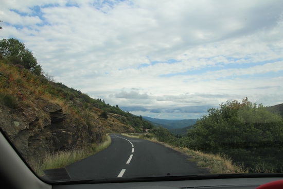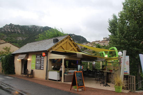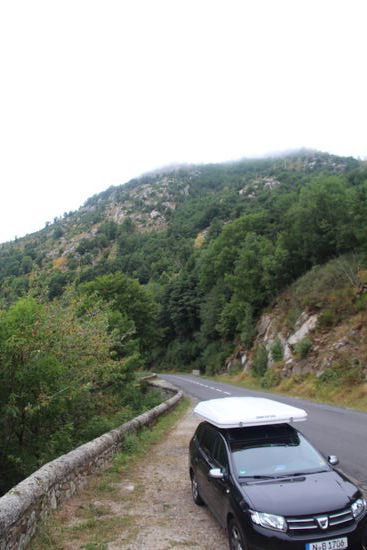 Leicht durchnässt sitze ich gegen 8:30 Uhr im Auto - ohne Kaffee o.ä. und fahre los. Nur 2 km bis Le Rozier - wieder ein wunderhübscher Ort. Und weil es hier auch Bäcker und Spar-Laden gibt und meine Kühlbox wieder mit Vorräten aufgefüllt werden muss, parke ich. In einem kleinen Café kann ich dann sogar Kaffee und Croissant bekommen und als ich um 9 Uhr dann wirklich starte, fühle ich mich schon etwas besser.