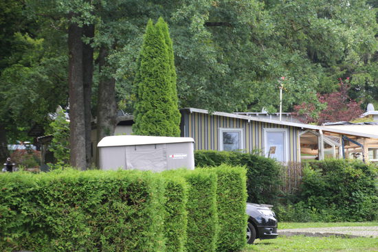 Da der Platz für mich frei ist, darf ich ohne Aufpreis auch direkt schon reinfahren. Sieht lustig aus: mein Kombi zwischen zwei dichten Hecken, an jeder Seite nur noch ca. 1 m Platz, aber mit eigenem Strom- und Wasseranschluss