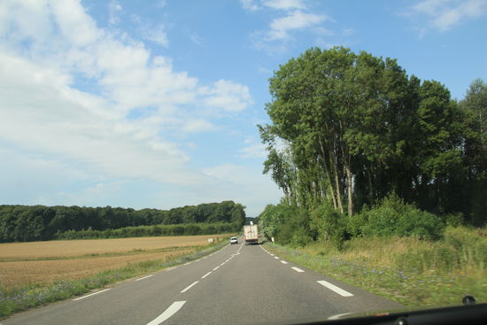 Es wechseln Kornfelder und Wälder, die Landschaft ist hügelig und die Straßenränder sind mit bunten Wiesenblumen gesäumt.