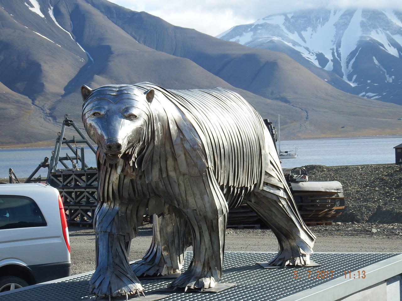 Wenigstens sahen wir auf dieser Reise einen ausgestopften Eisbären. Bei den wenigen und kleinen Eisschollen, die wir in den Gletscherfjorden gesehen haben, fragt man sich, wo denn die Eisbären überhaupt noch sein sollen. Dennoch darf man sich auf Spitzbergen ausserhalb der Ortschaften nicht ohne Gewehr fortbewegen.