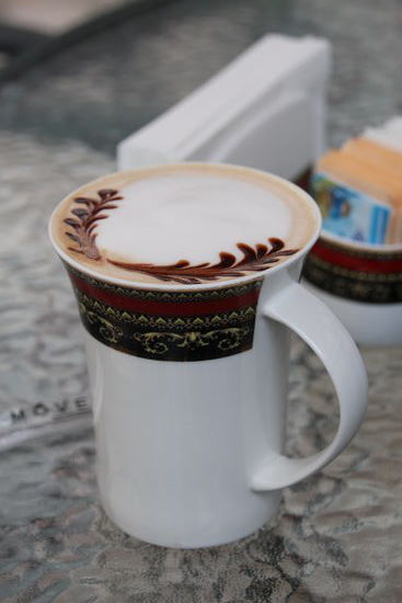 Gegen 13:30 bin ich wieder im Hotel und so k.o., dass ich erst einmal schlafen muss. Jetzt merke ich, dass mein Wecker kaputt ist. Also muss ich mir irgendwo einen neuen kaufen. Behelfsweise stelle ich mein Handy auf Timer weil die Uhrzeit nicht auf die Lokale umstellen will und mir die Rechnerei gerade zu viel ist. Nach 3,5 Stunden werde ich aus dem Tiefschlaft geweckt. Um richtig aufzuwachen, gönne ich mir eine Latte Macchiato in der schicken Coffee Bar des Hotels für sage und schreibe 55 Yuan (incl. 10 % Bedienung). Die Latte Macchiato ist zwar sehr hübsch gemacht und gut, aber völlig überteuert. Das sind bei dem schlechten Wechselkurs mal eben 8-9 Euro für eine Tasse Kaffee.