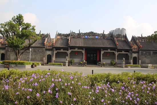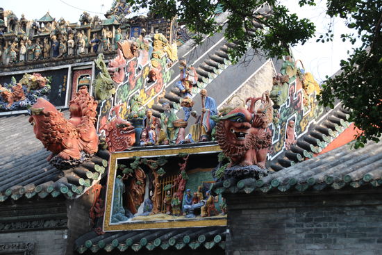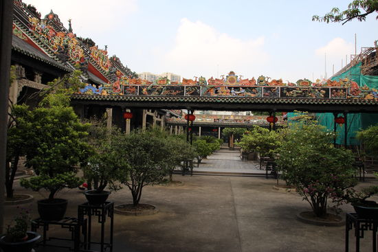 Heute darf ich wieder etwas länger ausschlafen. Wir müssen erst um 09:30 los. Bevor wir uns auf den Weg nach Hongkong machen, besichtigen wir noch den Ahnentempel der Familie Chen. Durch glückliche Umstände ist er während der Kulturrevolution erhalten geblieben. Der Tempel ist insgesamt sehr schön. Am eindrucksvollsten finde ich aber die Reliefs an der Vorderfront des Tempels. Sowohl die einfarbigen als auch die bemalten. Sie sind richtig dreidimensional. Eine tolle Arbeit. Im Tempel gibt es mehrere Shops. Im hintersten kommt ein älterer Herr um die Theke herum als er mich sieht und auf mich zu. Was er wohl will? Da zieht er ein Maßband auseinander und fängt an, mich zu messen. Er ist ganz begeistert. Verkaufen will er mir nichts. Das habe ich in Asien schon öfter erlebt, dass der Geschäftssinn in dem Moment vernachlässigt wird.