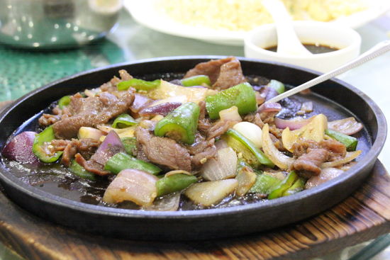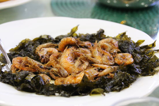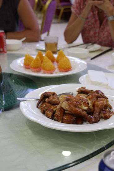 Für unser letztes Mittagessen in China halten wir in einer Einfahrt, die nach Industrieansiedlung aussieht. Wir fahren mit einem Aufzug in den fünften Stock. Das Essen ist auch noch einmal ganz gut. Witzig ist, dass es etwas frittiertes gibt, bei dem uns niemand, auch Frau Zhang oder die Bedienungen uns nicht sagen können, was es eigentlich genau ist. Es gibt wieder Ente. Außerdem gebratenen Reis, Frühlingsrollen (die es nicht oft gegeben hat) und noch einmal kleine leckere Shrimps auf einem Algenbett. Die Algen habe ich weggelassen, aber nachdem die meisten keine wollten, habe ich die halbe Platte Shrimps gegessen. Schweinefleisch süßsauer und Rind mit Zwiebeln war wie üblich. Nur waren beim Rind statt Paprika Peperoni verarbeitet. Bei denen musste man höllisch aufpassen.