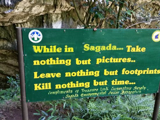 Am Parkplatz zu den hängenden Gräbern habe ich dann wieder einen neuen Guide. Erst geht es einen eher gemütlichen Weg zu einem normalen Friedhof, dann aber wieder steil bergab teilweise mit Treppen. Nicht schon wieder. Das muss ich nachher doch alles wieder hoch. Mein Guide grinst nur und meint „gutes Training“. Ich habe aber langsam echt genug. Von den hängenden Gräbern hätte ich mir mehr erwartet. Es ist nur eine Hand voll. Wie mein Guide selbst zugibt waren es nur wenige, die das aus religiösen Gründen gemacht haben. Dann hat man gemerkt, dass das auch für Touristen interessant ist aber das letzte Grab ist hier vor 7 Jahren aufgehängt worden. Früher hat man die Toten auch in Särgen aber in einer Höhle bestattet, die wir später noch anschauen werden. Heutzutage ist es für die meisten aber mit Abstand am bequemsten, wenn sie auf dem regulären Friedhof bestattet werden.