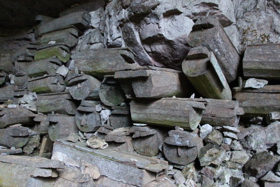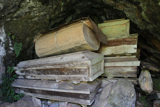 Jetzt geht es noch zu der Bestattungshöhle. Die haben sie sich als letztes für mich aufgehoben, weil die Besichtigung „weniger anstrengend“ ist. Naja, das ist relativ. Es geht nämlich nach wenigen Metern schon wieder einen steilen Treppenweg in das Tal runter. Hier sind einige Särge zu sehen. Sowohl neuerer Bauart, als auch alte, die aus einem Baumstamm geschnitzt werden, und mit einem Holzpflock verschlossen werden. Es wird also kein einziger Nagel verwendet.