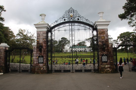 Wir fahren erst Richtung Süden aus dem Gebirge heraus, dann nach Westen und dann wieder in die Berge weil Baguio auch in den Bergen liegt und als „Sommerhauptstadt“ der Einwohner Manilas gilt. Die Temperaturen sind hier im Sommer um einiges angenehmer als im Tiefland. Gegen 14:00 legen wir bei einem netten Aussichtslokal oberhalb eines Stausees eine Mittagspause ein. Ich trinke nur einen Kaffee während meine Gastgeber Mittag essen. Frau Bustamante legt mir eine ganze Tüte mit Teilchen, die mit Pudding gefüllt sind dazu. Zwei esse ich. Das reicht mir. Als ich zahlen will, ist mein Kaffee bereits gezahlt. Eine Stunde später, gegen 16:00 sind wir dann in Baguio. Als erstes halten wir für einen Fotostopp bei „The Mansion“. Hier hält sich der Staatspräsident immer an Silvester auf