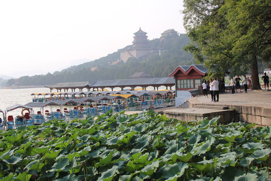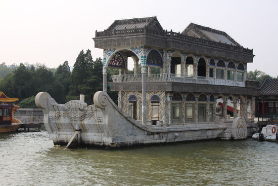 Letztes Besichtigungsziel heute ist der Sommerpalast etwas außerhalb von Peking. Er gilt als die größte kaiserliche Gartenanlage der Welt. Besonders schön ist hier wieder der See, der ein Drittel des riesigen Geländes ausmacht und auf dem man auch mit Booten herumfahren kann. Interessant war auch, einem Chinesen zuzuschauen, der mit Wasser Kaligraphien auf die Straße gemalt hat. Als besondere Attraktion gilt der 780 Meter lange Wandelgang. Es soll der längste der Welt sein. Am Ende des Wandelganges liegt dann noch ein imposantes Marmorschiff am Ufer des Sees.