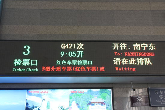 In der oberen Zeile stehen Start- und Zielbahnhof und der Zug. Wir fahren mit der Zugklasse D. Das ist zurzeit der beste und schnellste Zug in China. Darunter Waggon und Sitzplatz. In der untersten Reihe steht ein Name (bei mir Stefan) und die Reisepassnummer. Das bedeutet aber auch, dass man beim Kauf einer Zugfahrkarte auf jeden Fall den Reisepass dabei haben muss. Das ist für mich etwas ganz neues. Es gibt mehrere Wartehallen immer für wenige Gleise. Dort müssen wir noch fast eine Stunde warten. Frau Zhang meint aber, wir sollen jetzt schon unser Gepäck direkt vor den Absperrungen abstellen, die erst kurz vor Einfahrt des Zuges geöffnet werden. Kurz vor der Öffnung beginnt so langsam das Gedrängel der Chinesen, aber wir behaupten unsere Plätze. Wir haben zwar unsere Sitzplätze, aber das Problem ist der Platz für unser Gepäck. Bei zwei Reisegruppen mit relativ viel Gepäck wird es eng. Wir sind aber als erste in unserem Waggon und bekommen es gut unter. Die Sitzplätze selbst haben angenehm viel Platz für die Beine. Der Zug beschleunigt ziemlich schnell auf 303 Km/h und das ist dann auch unsere Reisegeschwindigkeit. Wir fahren hier auf einer Trasse, die extra für den Schnellzug angelegt ist. Für das Schnellzugnetzt werden auch ganz neue Bahnhöfe relativ weit außerhalb der Städte aus dem Boden gestampft. Ich vermute, dass es in wenigen Jahren schon ein relativ dichtes Hochgeschwindigkeitsnetz geben wird. Der große Vorteil für Ausländer ist, dass hier in den Schnellzugbahnhöfen wie auch in den neuen U-Bahnen alles zweisprachig angeschrieben steht. Das Reisen auf eigene Faust wird aus dieser Sicht also tatsächlich immer einfacher. Trotz 5 oder 6 Zwischenstopps sind wir nach 3 Stunden 10 Minuten in unserem etwa 600 Kilometer entfernten Ziel angekommen.