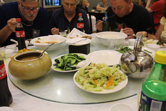 Gegen 18:30 fahren wir dann weiter Richtung Luoyang, wo wir übernachten. Draußen herrscht so ein Nebel, dass absolut nichts zu sehen ist. Entsprechend langsam fahren wir und kommen erst gegen 20:30 im Luoyang Grand Hotel an. Nachdem es morgen wieder weiter geht, packe ich nichts aus sondern stelle nur meinen Koffer auf mein Zimmer. 20:45 treffen wir uns zu siebt, um um das Hotel herum nach etwas essbarem zu suchen. Im ersten Restaurant, in das wir uns entschließen, rein zu gehen, werden wir abgewiesen. Sie machen bereits Feierabend. Danach kommt erst einmal nichts mehr. Also kehren wir um und bleiben vor einem anderen Lokal stehen, das wie ein Feuertopfrestaurant aussieht. Da sehen wir drinnen einen aus der Gruppe B. Der winkt uns, wir sollen rein kommen. Er sitzt mit seiner Begleiterin vor einem Suppentopf mit Weißkohl, Schweinerippchen und –Füße. Die Karte zeigt nur 5 oder 5 Variationen auf. Wir bestellen auf gut Glück. Erst wollen zwei nichts, als dann der Topf ankommt, die Soßen angerührt werden (Sesam oder Erdnusssoße mit einer Chillipaste), und die Plastikhandschuhe verteilt werden, da wollen die beiden doch auch mitessen. Der Berg an Fleisch ist schnell abgetragen und auch der Nachschub, der nachgelegt wird, wird verspachtelt. Dazu trinken wir Bier und Cola. Am Ende zahlen wir alle zusammen 203 Y. Es war lecker und dazu lustig, mit den Fingern zu essen.