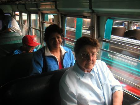 Heute kommt meine Mutter mit in die Schule. Und sie staunt nicht schlecht, wie das hier aussieht. Unter dem Blechdach, wo am Sonntag die Geburtstagsparty von Julissa stattfand, sitzen sich jeweils eine Lehrerin und eine Studentin an einem kleinen Tisch gegenüber und arbeiten. Es wird gelernt, gespielt, gelacht, geschrieben und studiert. Ich mache sie mit Olga bekannt und wir machen uns zusammen auf den Weg zur zentralen Busstation. Wir fahren mit einem der farbigen Busse ins Nachbardorf San Antonio Aguas calientes.