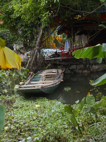 Mit dem Zug nach Ninh Binh gefahren. Bei der vietnamesischen Eisenbahn gibt es soft - seats und hard-seats, wir haben für nur 2,5 Stunden Fahrt aus Ersparnisgruenden hard- seats genommen. Jetzt wissen wir, das das Holzbank heißt und die Geldersparnis fällt nicht wirklich ins Gewicht. Hier in Vietnam ist übrigens jeder Millionär, 1 € entspricht 25.000 Dong. Am Bahnhof steigen mit uns viele andere Rucksacktouristen aus, da die sogenannte trockene Halong Bucht ein Highlight jeder Vietnamreise ist. Wir haben gelernt, dass es gut ist, erst einmal auf einen Kaffee oder Imbiss ins nächste Café zu gehen, bis sich die Aufregung am Bahnhof gelegt hat und die allzu aufdringlichen Taxifahrer abgezogen sind. Meist bekommt man von den Wirtsleuten ein paar hilfreiche Tipps und sie organisieren einem ein günstiges Taxi. Unser Quartier diesmal ist 6,5 km vom Bahnhof entfernt, doch liegt es zu unserer Freude im kleinen Ort Tam Coc, direkt an einem schönen Fluss gelegen. Am Nachmittag erkunden wir zu Fuss die nächste Umgebung: viele Reisfelder, die um diese Jahreszeit teilweise schon abgeerntet sind. Große Plakate zeigen, dass die frischen Felder im Frühjahr hier in allen Farbschattierungen von grün und gelb leuchten. Aber auch jetzt hat die Landschaft ihren Reiz, denn ebenso wie in der Halong Bucht gibt es hier riesige Karstfelsen, welche die Landschaft prägen. Auch wenn das hier trockene Halong Bucht heißt, steht doch ein großer Teil der Landschaft unter Wasser, teils weil der Reis natürlich im Wasser wächst, teils auch auf Grund der starken Regenfälle der letzten Zeit und so bleibt der Besuch eines nahen Tempels quasi im Wasser stecken. Eine Attraktion dieses Dorfes ist eine Bootstour durch nahegelegen Höhlen. Ganze Busladungen von Menschen kommen dann hier an und die Boote fahren eins hinter dem anderen über den Fluss. Unsere Vermieterin gibt uns den Tipp, gleich morgens um 7 zu fahren. Nicht ganz unsere Zeit, aber wir stellen uns mal den Wecker. Um 5.45h schrecken wir von einer Lautsprecherdurchsage hoch, später hören wir, es sei das lokale Radio, und so ist das Aufstehen gar kein Thema mehr. Um 7h stehen wir am Anleger - viele Frauen machen gerade noch große Wäsche, doch einige Boote sind schon bereit. Alleine mit unserer Fahrerin Mai, die das Boot, wie alle hier, mit den Füßen rudert, sind wir auf dem Fluss und sobald wir die letzten Häuser hinter uns lassen, sind Reiher und Eisvögel unsere Begleiter. Fast unhörbar gleitet das Boot dahin und ein Gefühl von "Like the first morning" breitet sich bei uns aus. Ziegen kraxeln auf unsichtbaren Pfaden durch die Karstfelsen, Fasane fliegen auf und Fischer holen ihre Netze ein. An einigen Stellen hat sich der Fluss, Ngo Dong, seinen Weg unter den Karstfelsen gesucht, dann fährt das Boot wie in eine niedrige Höhle, mächtige Tropfsteine hängen von der Decke und im Moment der größten Dunkelheit taucht das Licht des Ausgangs auf. Auf dem Rückweg begegnen wir einer größeren Gruppe. Sie wird eskortiert von einer vietnamesischen Fotografin, einem Boot mit Shop und einer Karaoke-Sängerin -soviel "Glück" kann man auch haben. Nach zwei Stunden kommen wir reich beschenkt wieder an und haben noch ein paar neue vietnamesische Wörter gelernt.