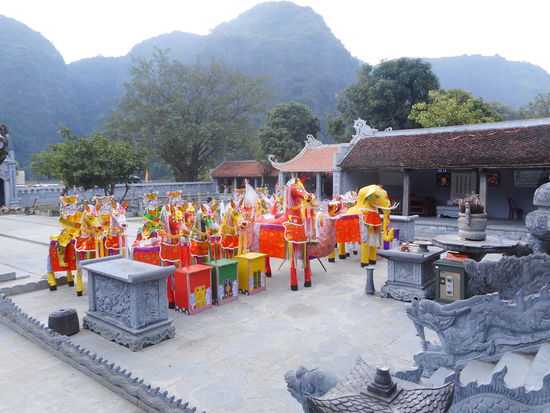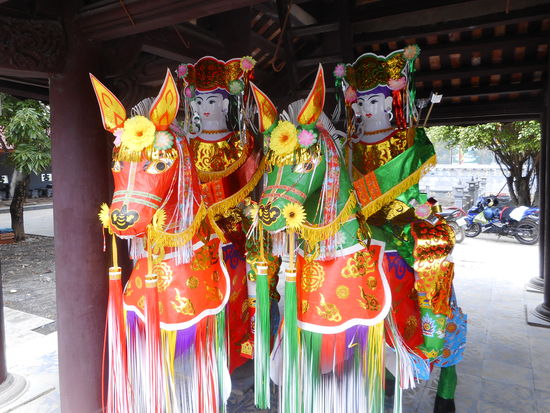 Trockenen Fußes erreichen wir den Thai Vi Tempel. Von weitem hören wir schon lautes Trommeln, Glockengeläut und Gesang. Der Tempel ist mit zahlreichen Papierreitern, Papierpferden und Kriegern , alles in fast Lebensgröße, geschmückt. (Den Tempel hat 1258 ein König der Van Dynastie ,der in der Halong Bucht die Mongolen vernichtend geschlagen hat, gegründet). Gläubige nehmen jetzt an einen Zeremonie teil. Auch hier schmücken zahlreiche Opfergaben den Tempel. Für uns ein schönes Erlebnis hier teilnehmen zu dürfen.
