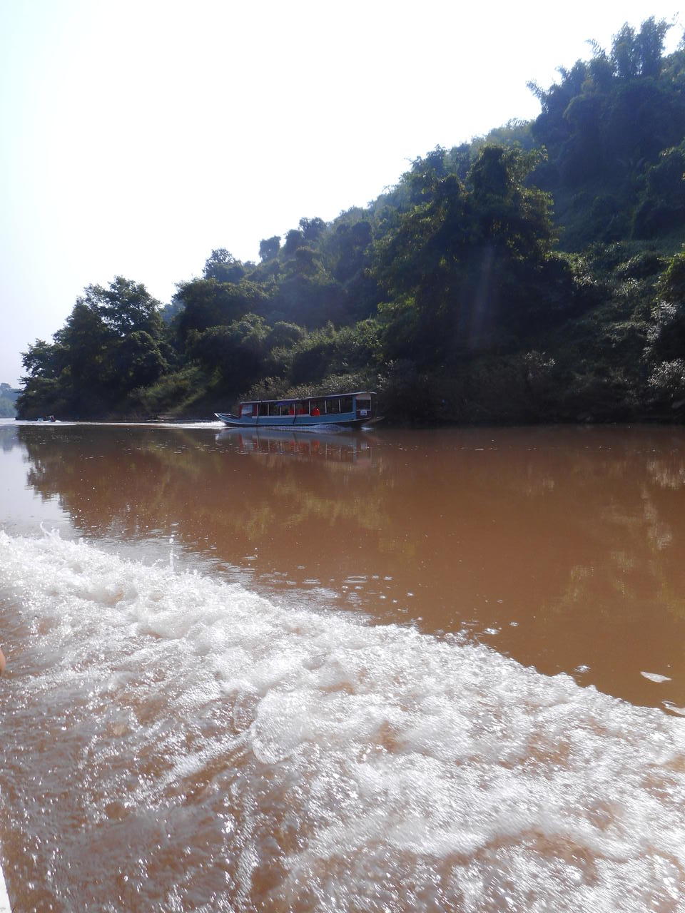 Auch dieser Bus ist gut gefüllt, diesmal aber mit Menschen; wir fühlen uns wohl, sind aber ganz schön hungrig. Die Fahrt verläuft ruhig und wie üblich, einladen, ausladen, einsteigen, aussteigen. Der Grenzübergang bei Tay Trang ist unproblematisch, es wird sogar mit einem "Fieberthermometer" ein Gesundheitscheck gemacht; für 2 Dollar pro Person, so kommt man auch an Devisen! Auf laotischer Seite bleibt die dichte, grüne Berglandschaft erst einmal gleich. Im nächsten größeren Ort Muang Khuao steigen wir als einzige Gäste aus, die anderen Reisenden fahren nach Luang Prabang weiter.
