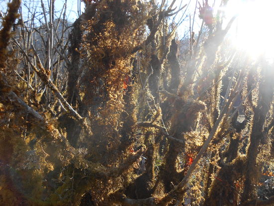 Langsam verlassen wir Dunchet, über steile Treppen aufwärts. Nach einiger Zeit wechseln wir von Reis-, Mais-, Gersten- und Kartoffelfeldern in eine feuchte Waldlandschaft. Wir kommen uns vor wie bei " Herr der Ringe". Überall hängen die unterschiedlichsten Flechten wie lange Haare von den Bäumen. Umgestürzte, von Moos überzogene Baumstämme bedecken den Boden. Es ist wie ein Märchenwald.