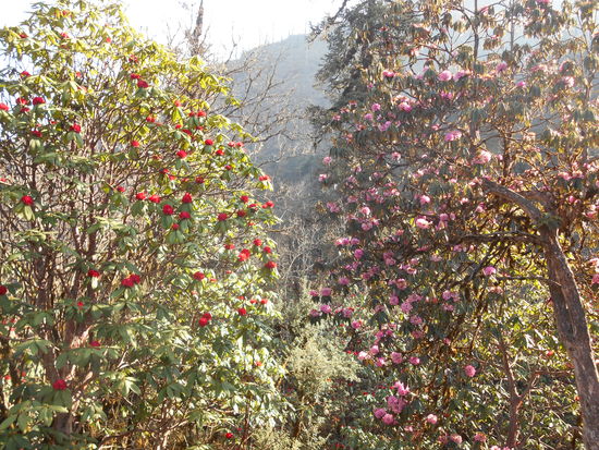 Da wir gestern schon sehr früh im Bett waren sind wir alle schon früh wach und werden mit Rauhreif auf den Wiesen und einer wunderbar klaren Sicht auf das Massiv des Manaslu begrüßt. Das unsere Wegstrecke heute nicht so weit ist, können wir noch ausreichend lange in der Umgebung herumstromern und die gewaltigen Rhododendron Bäume sowie Mengen an Seidelbast bewundern. In der ersten Morgensonne scheinen scheinen die Rhododendron regelrecht zu brennen. Nachdem die Zelte getrocknet und eingepackt sind, führt uns der Weg weiter durch diesen Rhododendronwald der immer wieder durch, wie weisse Kerzen leuchtende, Magnolien aufgelockert wird. Nach kurzer Zeit erreichen wir eine Alm auf der es Schafe, Ziegen und Kälber gibt. Hauptsächlich werden hier aber in der Nähe gefällte Baumstämme bearbeitet. Die Stämme werden in händelbare Längen geschnitten und dann mit Beilen zu Balken verarbeitet. Anschließend werden sie an Trockengestelle gelehnt. Von den Arbeitern , drei Jugendlichen zwischen 12 und 14 Jahre sowie einem jungen Mann werden wir zum Essen eingeladen. Es gibt Hirsebrei mit Linsen. Nach dem einfachen Mahl bietet mir der jüngste noch von seinem selbstgemachten Popcorn an und ich kann mich mit meinem Taschenmesser revanchieren, was er sehr erfreut annimmt.
