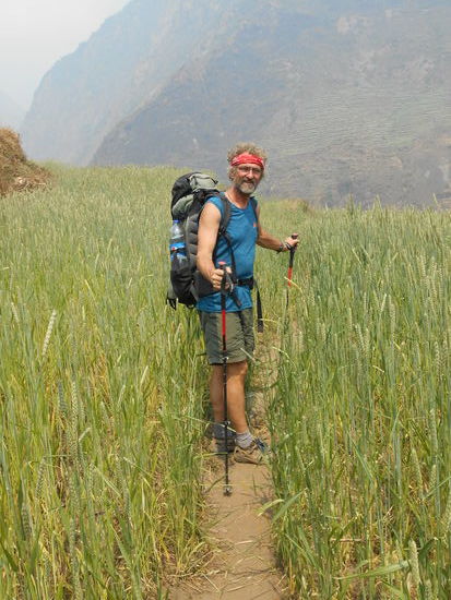 Nach einer Nacht auf sehr harter Matratze steigen wir langsam abwärts. Unser Weg führt uns auf und ab durch Terrassenfelder mit Weizen, Gerste und Hirse. Die Kartoffel wächst zusammen mit Bohnen, der Mais zusammen mit Erbsen. Die Hirse ist reif und wird gerade geerntet. In den kleinen Ortschaften unterwegs gibt's immer wieder schöne Begegnungen mit den Menschen. Da eine Hängebrücke seit dem Erdbeben zerstört ist, müssen wir abenteuerlich, über Steine hüpfend einen kleinen Fluss überqueren. Die Sonne brennt den ganzen Tag sehr stark und macht das Laufen anstrengend. Um 2 Uhr am Nachmittag kommen wir schon in Kapurgon, unserem heutigen Tagesziel, an. Ein kleines Dorf ohne Shop und Guesthouse. Tina hat wegen zuviel Sonne und zuwenig trinken Kopfweh und verschwindet erst mal an einen Schattenplatz zum Mittagsschlaf. Angelo läuft mit Rahul noch ins Nachbardorf um ein paar Lebensmittel für's Abendessen einzukaufen. Ich laufe ein bisschen durchs Dorf und bin bald von Menschen umringt, die sich von mir fotografieren lassen wollen um dann die Fotos im Kameradisplay anzuschauen. Es gibt hier kaum Spiegel, der eigene Anblick ist etwas Besonderes. Auch hier treffe ich wieder Menschen, die noch kaum einen Touristen zu Gesicht bekommen haben. Ein ganz besonderer Nachmittag. Später kommt Angelo vom Einkaufen zurück und hat zwei Flaschen Everst-Bier für den Abend mitgebracht. Rahul kommt erst später, er hat noch einen befreundeten Guide mit Träger getroffen die mit zwei Gästen unterwegs sind. Nach dem Abendessen ( Dhal Bat ) genießen wir unser Bier.