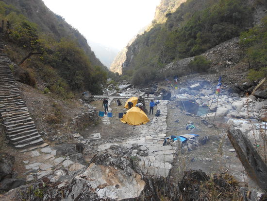 Hier bekommen wir einen Tee und machen eine Brotzeitpause mit Angelos letztem Peccorino und italienischen Brot. Etwas später erreicht auch die nächste Gruppe diesen Platz und für sie wird Dhal Bat gekocht. Ein Gewitter mit starker Regenschauer zieht auf und jeder sucht sich ein trockenes Plätzchen. Als sich das Wetter etwas beruhigt hat brechen wir bei leichtem Nieselregen in Richtung Tatopani auf. Wir erfahren, dass die andere Gruppe ebenfalls dort übernachten wird. Unsere beiden Begleiter verzichten auf ihr Zelt, leihen es den beiden anderen und wollen mit den Begleitern der anderen Gruppe in einem nahegelegenen Stall schlafen. Das bedeutet für uns eine Verbesserung des Speiseplans, da in der anderen Gruppe besser gekocht wird. Nach ca einer weiteren Stunde erreichen wir Tatopani: ein kleiner Lagerplatz unter einer Hängebrücke, mit drei angelegten Wasserbecken, welche von einer warmen Quelle gespeist werden. Trotz des Nieselregens machen wir uns sofort " badefertig " und genießen ein langes Bad in 40 Grad warmen Wasser direkt neben einem kalten Gebirgsfluss, der zur Abkühlung einlädt. Der Regen hat inzwischen aufgehört, die andere Gruppe ist ebenfalls angekommen und unsere Zelte stehen bereits. Am Abend genießen wir dann reichhaltiges Dhal Bat mit Brennesselsuppe.