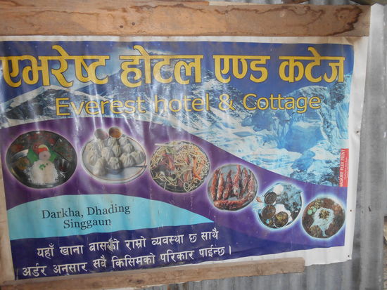 Der weitere Weg ist leider keine Freude mehr, da wir immer wieder durch die Baustelle einer neuen Strasse laufen müssen. Am späten Nachmittag erreichen wir dann Singang, eine kleine Ortschaft, von der aus wir morgen früh mit einem Jeep nach Kathmandu fahren können. Wir steigen im "Everest Hotel", einer kleinen Bretterbude mit offenen Seitenwänden, ab. Bei uns Zuhause wäre jeder Schafstall solider gebaut. Die Übernachtung ist kostenlos, dafür müssen wir hier aber zu Abend essen, was sich als großer Glücksfall entpuppt. Der Besitzer hat früher einmal in Indien und in Malaysia als Koch bearbeitet und hat sich hier jetzt selbstständig gemacht. Nach all dem Dhal Bat der letzten Tage gibt es hier wunderbar abgeschmeckte indische Gerichte. Ein kulinarisches Highlight zum Abschluss!