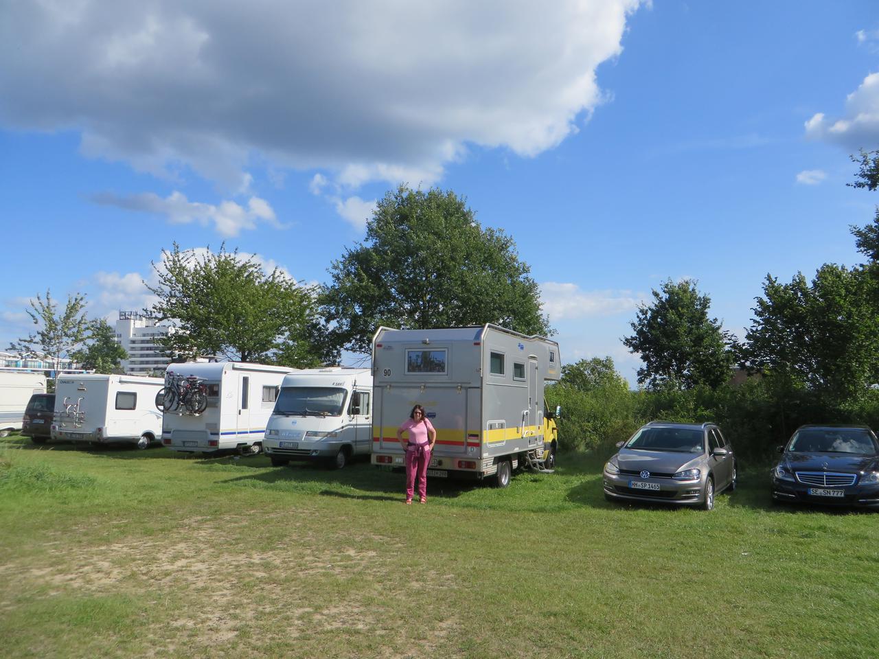 Auf dem Stellplatz ist leider schon alles besetzt, aber auf einer großen Wiese nebenan können wir aber für die Nacht stehen.