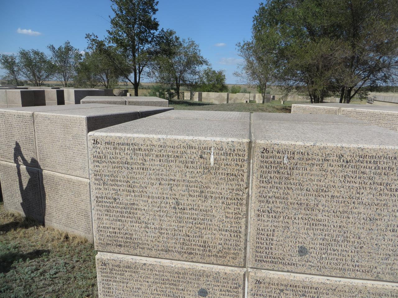 Wir sind über das weite Feld des Deutschen Friedhofs entlang der Mauer mit zigtausend Namen der Opfer gelaufen. Der Opfer wurde auf Tafeln an der Mauer und auf Würfeln gedacht. Es sind die Namen, Geburtsdaten und Todestag eingemeißelt.