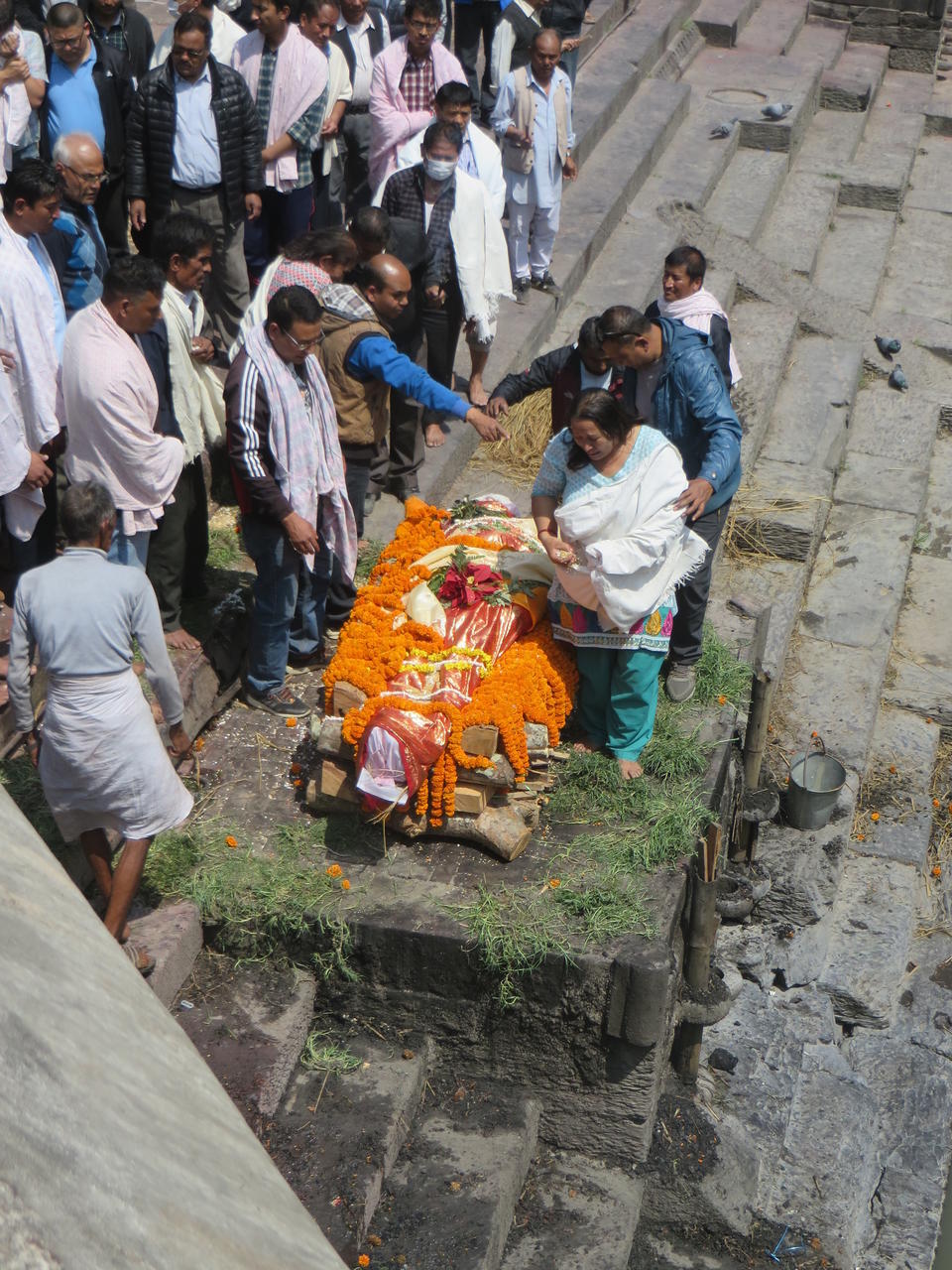 Der Verstorbene wurde auf dem geschmückten Scheiterhaufen abgelegt und die Angehörigen nahmen Abschied, indem sie dreimal um ihn herum gingen. Die weitere Zeremonie haben wir nicht mehr verfolgt.