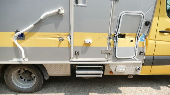 Dabei hat er uns ganz schön lädiert. Zum Glück geht alles noch, die Tür läßt sich öffenen, den Gaskasten haben wir dann zugeklebt. Dann kam die Polizei und es wurde verhandelt. Der Kontrahent hatte nur seinen Spiegel kaputt. Nach langem Hin- und Her sollten wir dann zur nächsten Polizeistation fahren. Dort wurde dann ein Protokoll aufgenommen. Wir mußten aber nichts bezahlen und konnten dann weiterfahren. Dumm gelaufen.