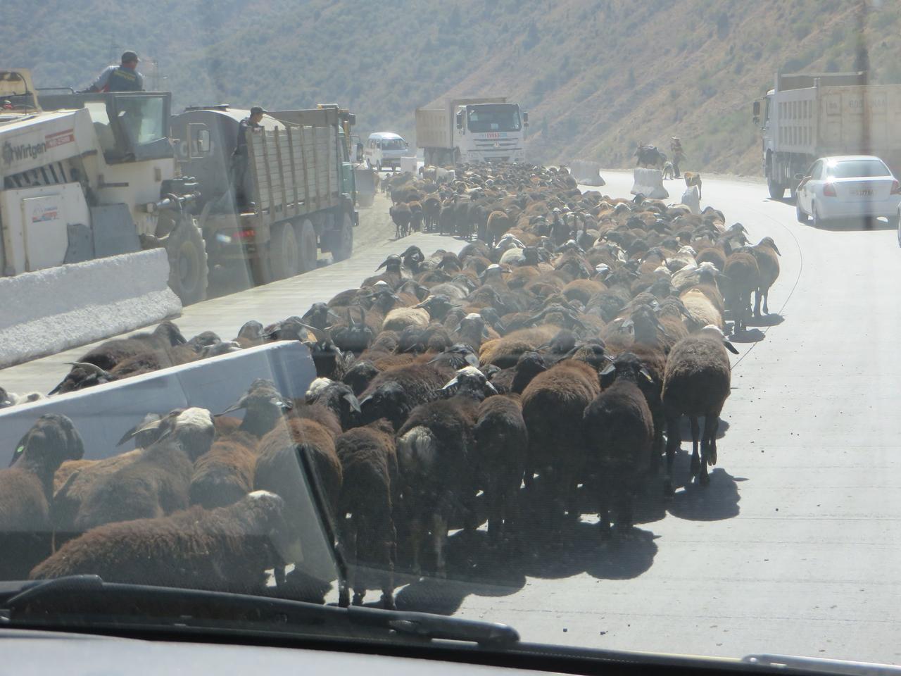 Wegen der Grenze machen wir uns schon früh auf. Wir sollen noch an einem Tankstopp halten, werden aber von einem Polizisten anders geschickt, so daß wir ahnungslos an dem Tankstopp vorbeifahren. Wir wundern uns schon, wie weit dieser außerhalb lieg,t fahren aber weiter. Später ruft uns Dima an, und dann verabreden wir, daß sie uns den Sprit mitbringen. Wir warten fast eine Stunde darauf und dann wird der Sprit eingefüllt, und wir können uns weiter auf die Route zur Grenze begeben. Unsere Fahrt auf einer guten Straße wird mehrmals unterbrochen, Schafe, Kühe und auch Pferde werden über die Straße getrieben und wir kommen dann nur langsam bis gar nicht vorwärts.