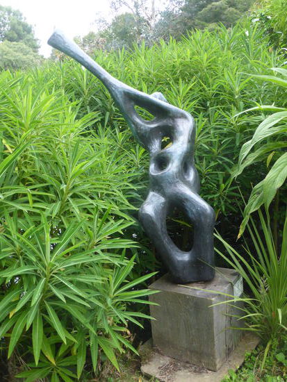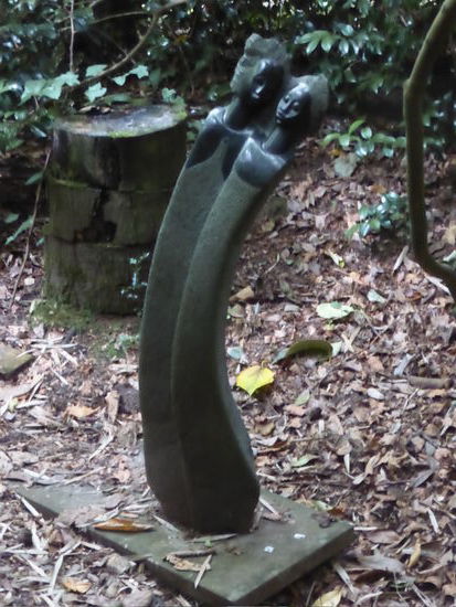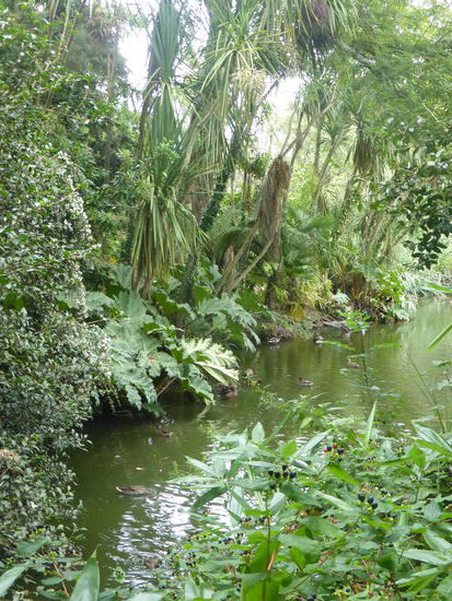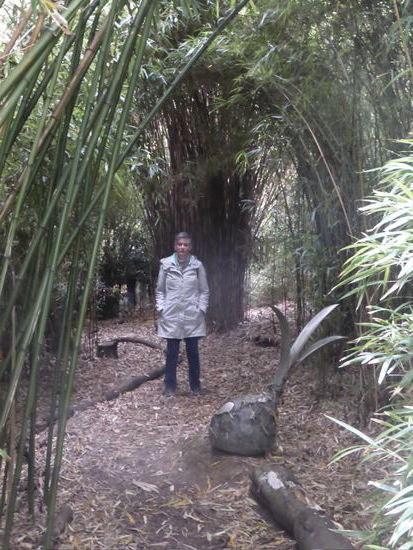 Ist der vordere Teil des Grundstücks noch äußerst gepflegt, so wirkt der subtropische Garten etwas vernachlässigt. Immerhin sind die verschlungenen Wege, die an den verschiedensten Kunstwerken unterschiedlichster Art vorbeiführen, mit Rindenmulch bequem begehbar gehalten.
