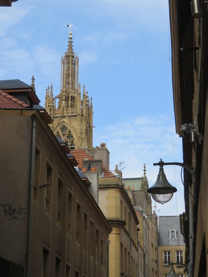 Der Tag ist noch jung, sodass ich beschließe, einen Abstecher ins benachbarte Metz, der Hauptstadt Lothringens, zu unternehmen. Zahlreiche alte Kirchen, Bürgerhäuser und Brücken, ein Mix aus mittelalterlichem Flair und Moderne empfängt mich. Mitten in der pittoresken Altstadt aus gelbem Jeaumont-Stein steht, wie ein Fels alles überragend, die 800 Jahre alte gotische Cathédrale Saint-Etiénne. Ihre leuchtenden Buntglasfenster tauchen das Innere in ein mystisches Licht und gaben der Kirche ihren Spitznamen „Gottes Laterne“.