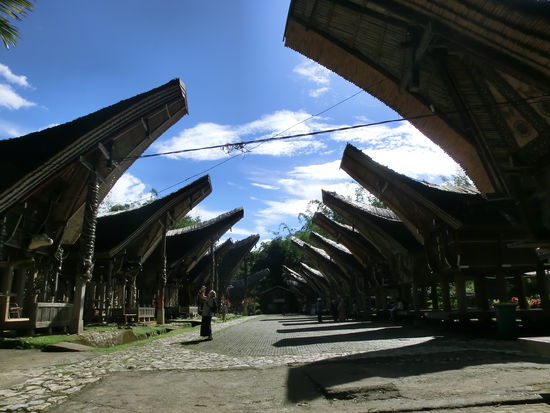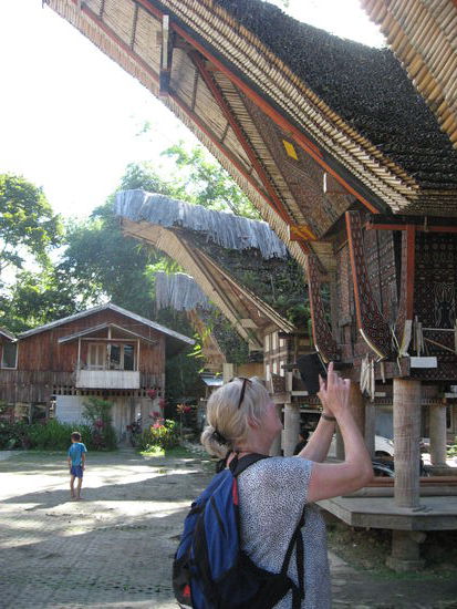 Der Flug in der kleinen Maschine auf dünnen Beinen mit Rollen am Ende war kurzweilig und über Tana Toraja (mit besser Wetter!) atemberaubend. Häuser von oben sehen ja alle gleich aus, meint man. Hier nicht. Die geschwungene Dachform ist einmalig und sehr charakteristisch und wahrscheinlich sogar aus dem Weltall zu erkennen … Diese Dachform wird uns die gesamte Zeit in Toraja begeistern, das wußten wir aber noch nicht.