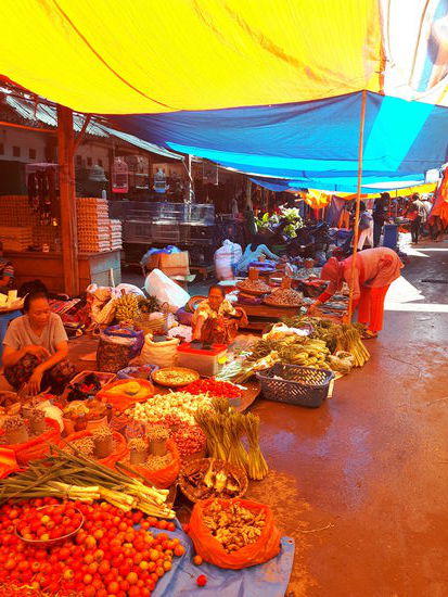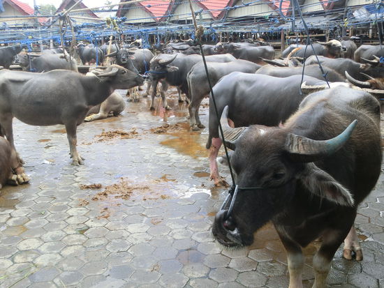 Der große Pasar Bolu Marktplatz quillt über vor geschäftigem Treiben und nachdem wir uns durch gelb und blau abgehängte Fisch-, Obst- und Gemüsestände durchgearbeitet haben, gelangen wir zum Viehmarkt.