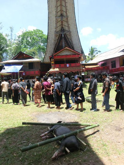Der Verstorbene war von einer hohen Kaste und so erfuhren wir, dass während der 4-tägigen Feierlichkeiten 18 Wasserbüffel und mindestens doppelt so viele Schweine geopfert werden sollten. Da wir am ersten Tag der Beerdigung da waren (die Frau war seit 2 Jahren tot), mussten wir das große Blutbad nicht miterleben. Allerdings wird für die Überführung der Seele in einen Zwischenzustand vor dem nächsten Leben ein Büffel als Transportmittel benötigt, Das war das einzige Opfertier des Tages ( Glück gehabt!!!).