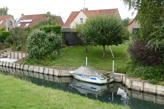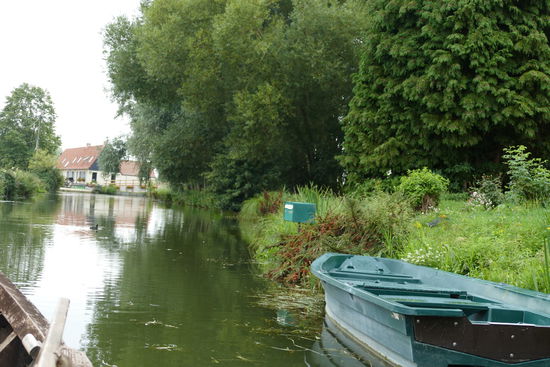 Für uns geht die Fahrt weiter auf der Autobahn in Richtung Norden. In Saint-Omer machen wir am Maison de Marais Station. Hier wollen wir uns zunächst die sehr sehenswerte Ausstellung zu dieser einzigartigen Sumpflandschaft anschauen. Zu 90 Prozent wurde sie von Menschenhand geschaffen, die das Marschland für sich nutzbar machte. So wurde Torf abgebaut, Kanäle gezogen und die Gegend wird bis heute für den Gemüseanbau genutzt. Wir fühlen uns an den Spreewald erinnert, denn rund 700 Kilometer Wasserwege durchziehen die Region. Viele Häuser und Höfe liegen auf Inseln und können nur mit dem Boot erreicht werden. Klar, dass auch wir uns auf eine rund einstündige, geführte Bootstour machen. Begleitet werden wir von einer netten, jungen Mitarbeiterin des Maison de Marais, die uns (auf Englisch) sehr engagiert die Besonderheiten dieser Wasserwege erklärt.